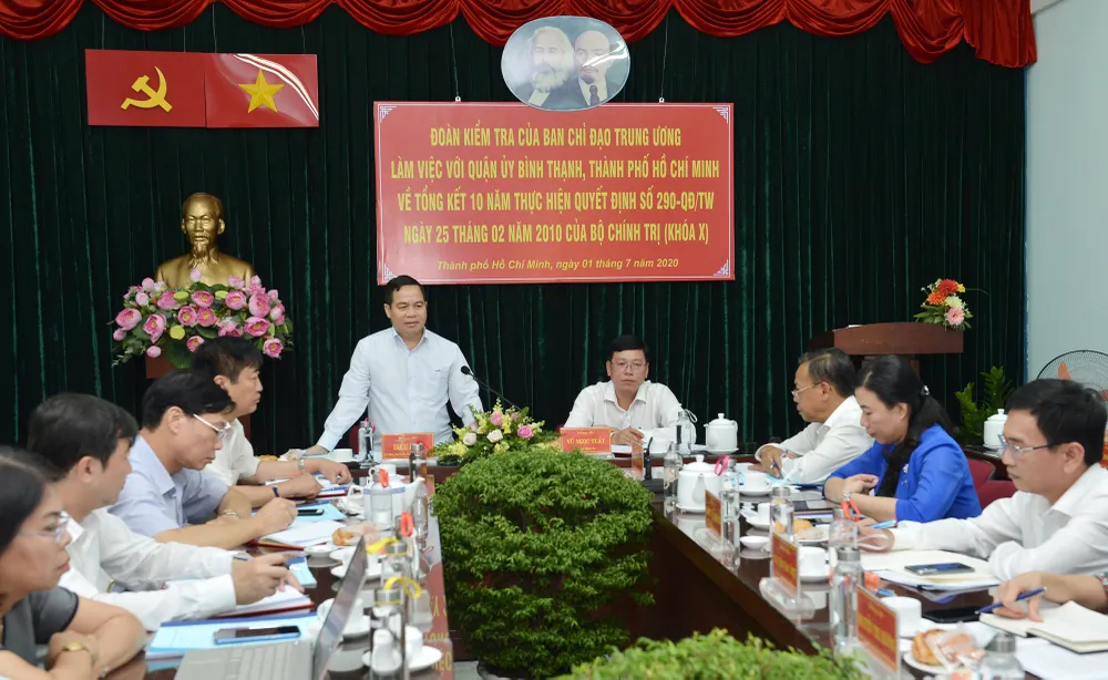Sáng 1-7, Đoàn kiểm tra của Ban Chỉ đạo Trung ương tổng kết 10 năm thực hiện Quyết định số 290-QĐ/TW ngày 25-2-2010 của Bộ Chính trị (Khóa X) về Quy chế công tác dân vận của hệ thống chính trị các quận, huyện ủy (Quyết định 290) do đồng chí Điểu K’Re, Ủy viên Trung ương Đảng, Phó Trưởng ban Thường trực Ban Dân vận Trung ương, làm trưởng đoàn, đã có cuộc làm việc với Quận ủy Bình Thạnh (TPHCM).