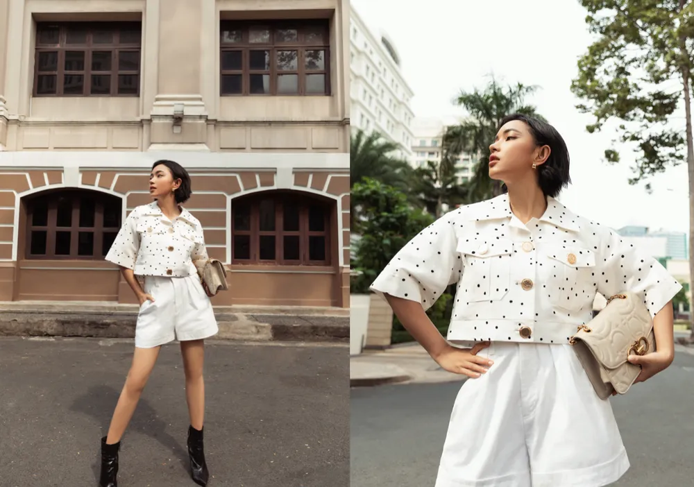 Hoa hậu Tiểu Vy và Fashionista Tú Hảo là hai tín đồ của quần lửng bermuda. Nếu Tiểu Vy chọn một thiết kế màu vàng bắt mắt, thì Tú Hảo lại ghi điểm bởi cách mix match quần lửng cùng áo jacket trắng ton-sur-ton