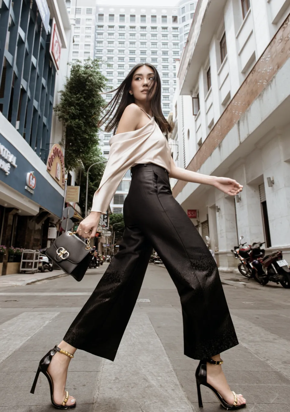 Bên cạnh white-on-white thì một cách phối màu cơ bản khác cũng được giới thời trang áp dụng là trắng và đen. Khác với những quý cô mộ điệu kể trên, influencer Thảo Nhi Lê lại chọn cách phối một chiếc áo lụa màu trắng ngà cùng với quần suông đen, thoát lên thần thái chuẩn chỉnh của một quý công công sở sành điệu.