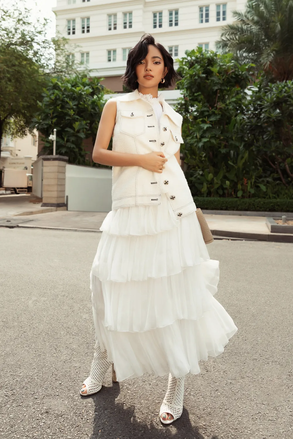 Khánh Linh trong một set trang phục gồm áo khoác gilet màu trắng, kết hợp cùng chân váy xếp li nữ tính. Cô sử dụng túi xách và giày ton-sur-ton theo phong cách phối đồ white-on-white khá khó trong thời trang.
