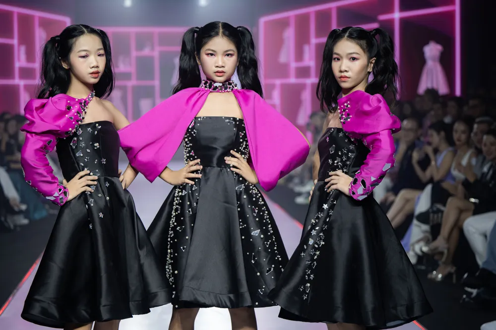BST sử dụng chất liệu chính là tafta và nhung nhám, với 2 màu chủ đạo là đen và hồng sen, cùng các kiểu mix match phụ kiện, kết đính thủ công các hạt, xoàn, đá... tạo nên những phiên bản mới mẻ cho các bạn nhỏ trong mùa lễ hội cuối năm. Hoa hậu Du lịch Việt Nam Toàn cầu Lý Kim Thảo sải bước với vai trò first face và Supermodel International 2022 Bùi Quỳnh Hoa diễn vedette.