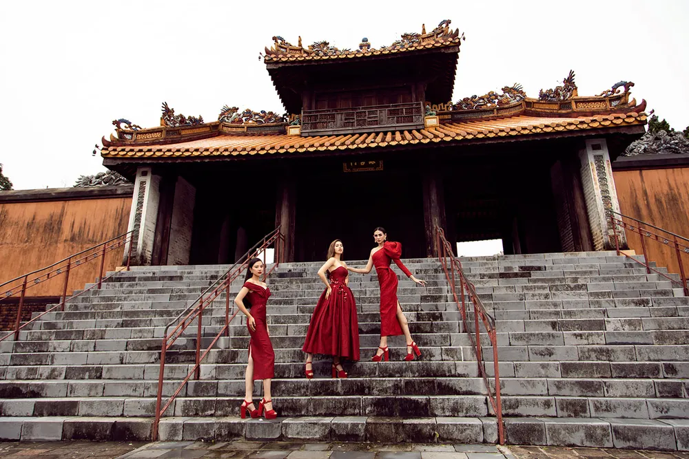 Khánh Vân, Mâu Thuỷ, Hương Ly tại Lăng Khải Định. Ảnh: NAG Nguyễn Long