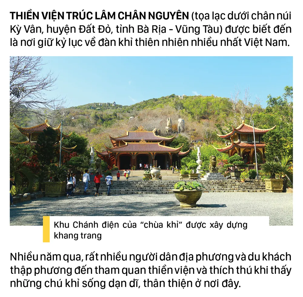 Thiền viện Trúc Lâm Chân Nguyên (tọa lạc dưới chân núi Kỳ Vân, huyện Đất Đỏ, tỉnh Bà Rịa - Vũng Tàu) được biết đến là nơi giữ kỷ lục về đàn khỉ thiên nhiên nhiều nhất Việt Nam.
