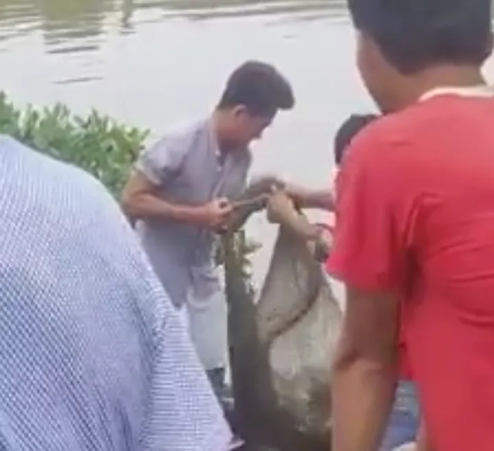 Người dân bắt cá sấu sổng chuồng khu vực vuông tôm xã Tân Tiến. Ảnh cắt từ clip