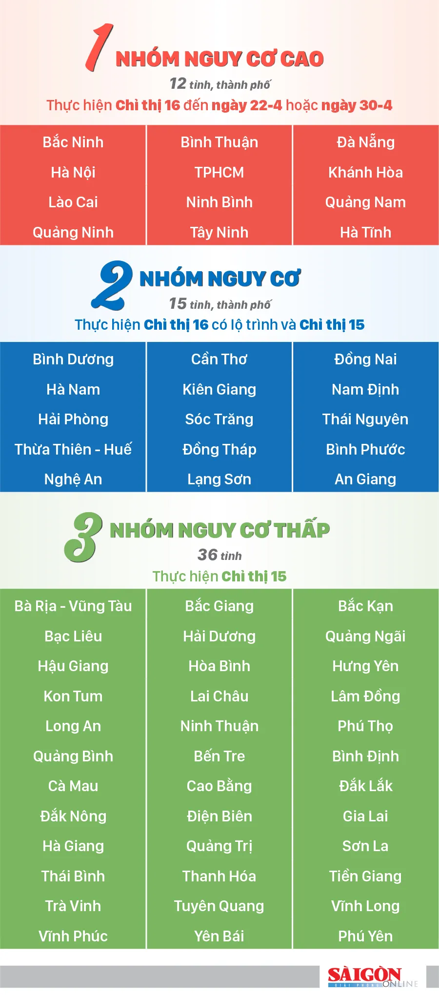 Chiều 15-4, Thủ tướng Nguyễn Xuân Phúc đồng ý với kiến nghị Ban Chỉ đạo quốc gia về phân loại nguy cơ dịch bệnh của các địa phương dựa trên các tiêu chí tình hình dịch bệnh hiện nay, phân tích dịch tễ học, các yếu tố dân số, giao thông, những nơi có nhiều người nước ngoài đến. Theo đó phân làm ba nhóm và thống nhất các nhóm này không phải là bất biến.
