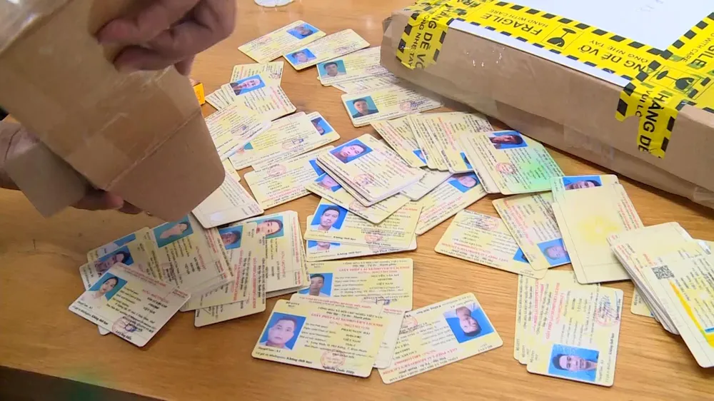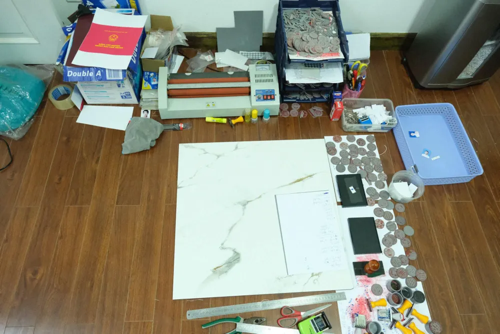 Quá trình đấu tranh chuyên án, cơ quan điều tra đã tạm giữ: 23 ô tô, 40 ĐTDĐ, 10 máy tính, 10 máy in các loại, 3 máy in thẻ nhựa, 3 máy ép nhiệt plastic, 3 máy dập dấu, 1 máy photo, 239 triệu đồng và hàng trăm con dấu giả, hàng trăm phôi và bằng lái xe, căn cước công dân, giấy đăng ký xe đã làm giả… và nhiều nguyên liệu để phục vụ làm giả giấy tờ khác…