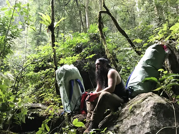 Jordan Vogt-Roberts bên trong khu rừng ở hang Sơn Đoòng