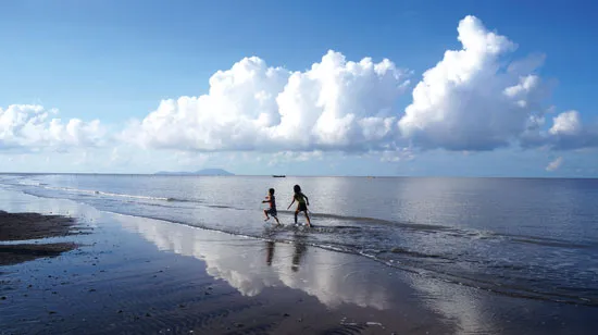 Sáng sớm hôm sau, anh Đương, hàng xóm của anh Bảy, lấy vỏ lãi chở chúng tôi ra cồn cát, lướt qua rừng đước, qua những ngư dân đang chăm chỉ giăng lưới, đổ đáy, đẩy te… cồn cát nổi lên giữa biển khơi, cách ấp Mũi chừng 2 hải lý. Như bức màn được vén lên, thiên nhiên hiện ra tuyệt đẹp, dải bạch vân trải mình qua bầu trời xanh thẳm soi bóng xuống mặt biển. Đứng trên cồn cát, phía nào cũng là trời là mây, là rừng là nước, tĩnh lặng, bao la… Những đứa trẻ nô đùa chạy nhảy, bơi lội, hòa vào thiên nhiên như mộng và thực hòa thành một để chiêm ngưỡng, để rung động…