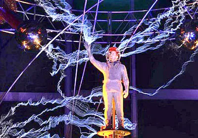 Đó là màn trình diễn đầy nguy hiểm của nhà ảo thuật người Mỹ 39 tuổi David Blaine (ảnh). Trong khi đứng trên một chiếc cột cao 6m, 7 máy phóng điện đặt xung quanh phóng điện liên tục vào David.