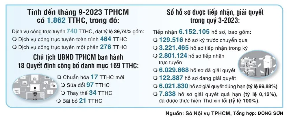 Tại phiên họp Ban Chỉ đạo CCHC TPHCM quý 3-2023 vào ngày 17-10, Giám đốc Sở Nội vụ TPHCM Huỳnh Thanh Nhân cho biết, công tác CCHC được thành phố tập trung thực hiện từ đầu năm đến nay. Tuy nhiên, vẫn còn những điểm nghẽn như: cung cấp dịch vụ công còn yếu; thanh toán trực tuyến chưa đáp ứng mục tiêu của Chính phủ; tỷ lệ hồ sơ quá hạn còn cao; số hóa hồ sơ, kết quả CCHC, xây dựng dữ liệu còn chậm; sắp xếp tổ chức bộ máy chưa đạt được như yêu cầu…