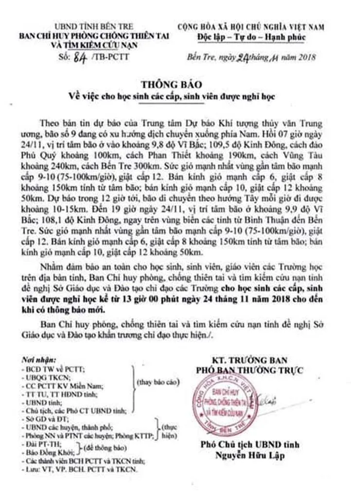 Các trưởng học trên địa bàn tỉnh Bến Tre thông báo nghỉ học tránh bảo số 9