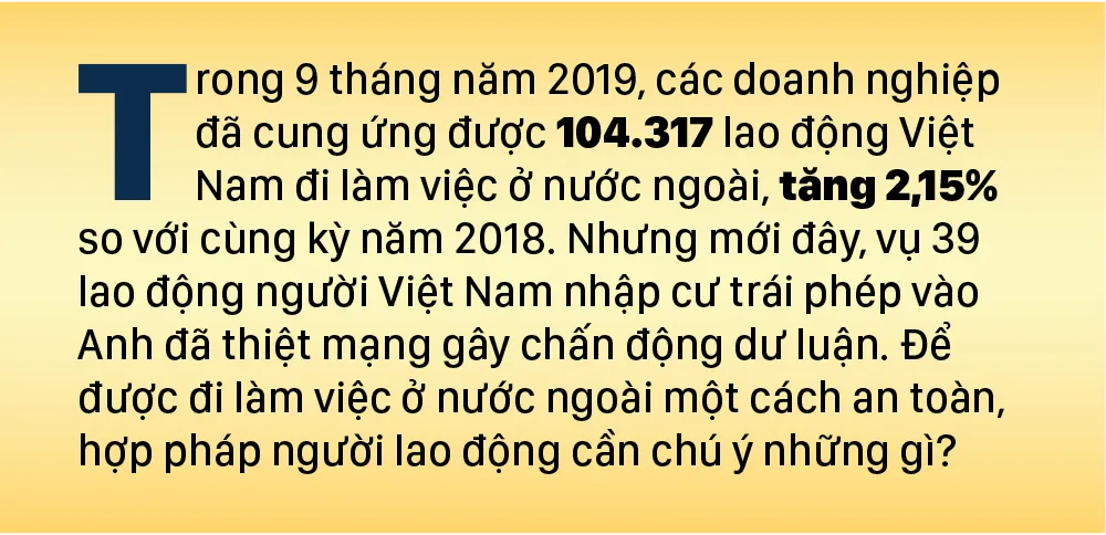 Trong 9 tháng năm 2019, các doanh nghiệp đã cung ứng được 104.317 lao động Việt Nam đi làm việc ở nước ngoài, tăng 2,15% so với cùng kỳ năm 2018. Nhưng mới đây, vụ 39 lao động người Việt Nam nhập cư trái phép vào Anh đã thiệt mạng gây chấn động dư luận. Để được đi làm việc ở nước ngoài một cách an toàn, hợp pháp người lao động cần chú ý những gì?