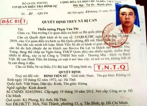 Ngày 7-11-2019, đã có lệnh truy nã đặc biệt đối với Đinh Tiến Sử do trong quá trình tống đạt quyết định khởi tố thì bị can Sử không có mặt tại nơi làm việc, nơi cư trú. Đến ngày 30-11-2019 Đinh Tiến Sử bị Công an tỉnh Thừa Thiên Huế bắt khi đang trốn tại TP Huế.