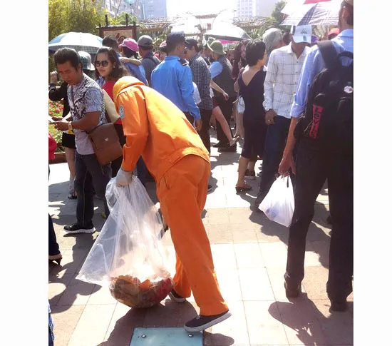 Trong dòng người đang náo nức vui tết, các công nhân vệ sinh vẫn lặng lẽ quét dọn, giữ vệ sinh đường phố. Một số công nhân Công ty TNHH MTV Dịch vụ công ích quận 1 còn len trong dòng người để nhặt rác.