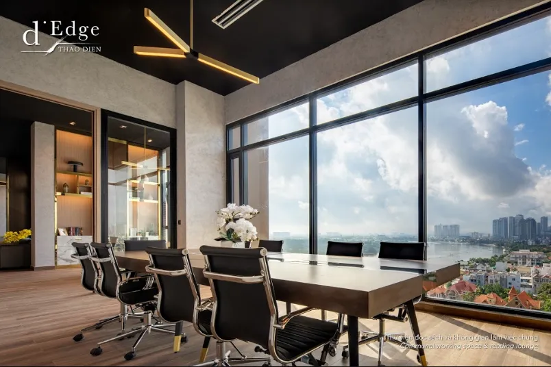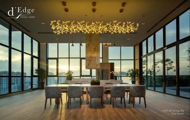 Sảnh tiệc trong nhà là một trong những tiện ích nổi bật nằm trên tầng thượng d’Edge Thảo Điền với tầm nhìn bao quát sông Sài Gòn