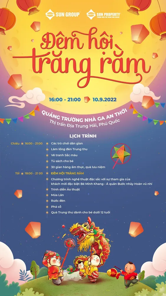 Năm 2020, Sun Group đã từng gây tiếng vang khi tổ chức Đêm hội trăng rằm, thu hút hàng nghìn người tham dự, mang tới một Trung thu đáng nhớ và ý nghĩa cho trẻ em ở An Thới, Phú Quốc. Với mong muốn duy trì nét văn hóa dân gian, tôn vinh Tết Đoàn viên đầy ý nghĩa và tạo một sân chơi lành mạnh, đáng nhớ cho trẻ em ở Phú Quốc sau 2 năm dịch Covid-19, Sun Property - nhà phát triển Bất động sản cao cấp thuộc tập đoàn Sun Group, sẽ đồng hành cùng các đơn vị mạnh thường quân tổ chức Chương trình Đêm hội trăng rằm tại Thị trấn Địa Trung Hải với quy mô lớn hơn và nhiều hoạt động hấp dẫn hơn so với năm 2020.
