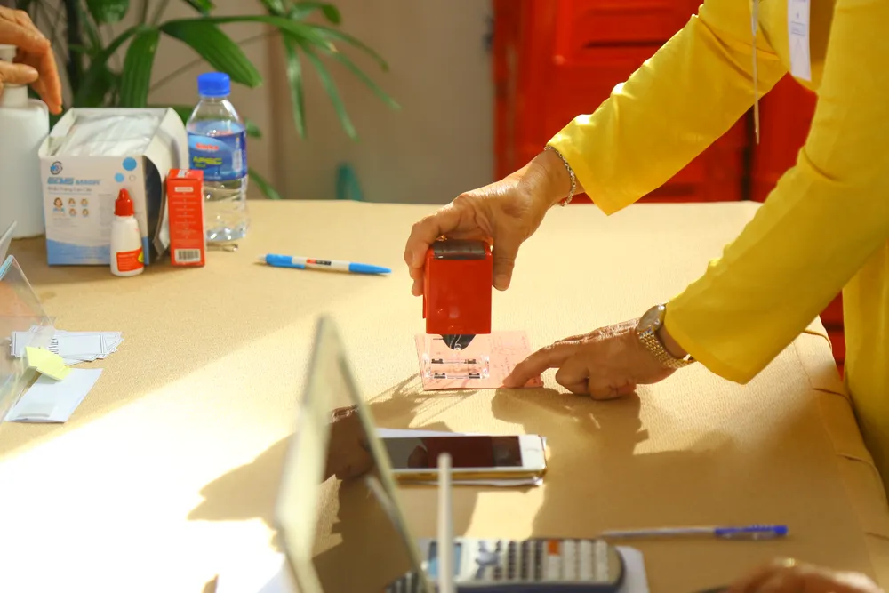 Đóng dấu chứng nhận "Đã bỏ phiếu" tại điểm bầu cử ở quận 3, TPHCM. Ảnh: HOÀI VŨ