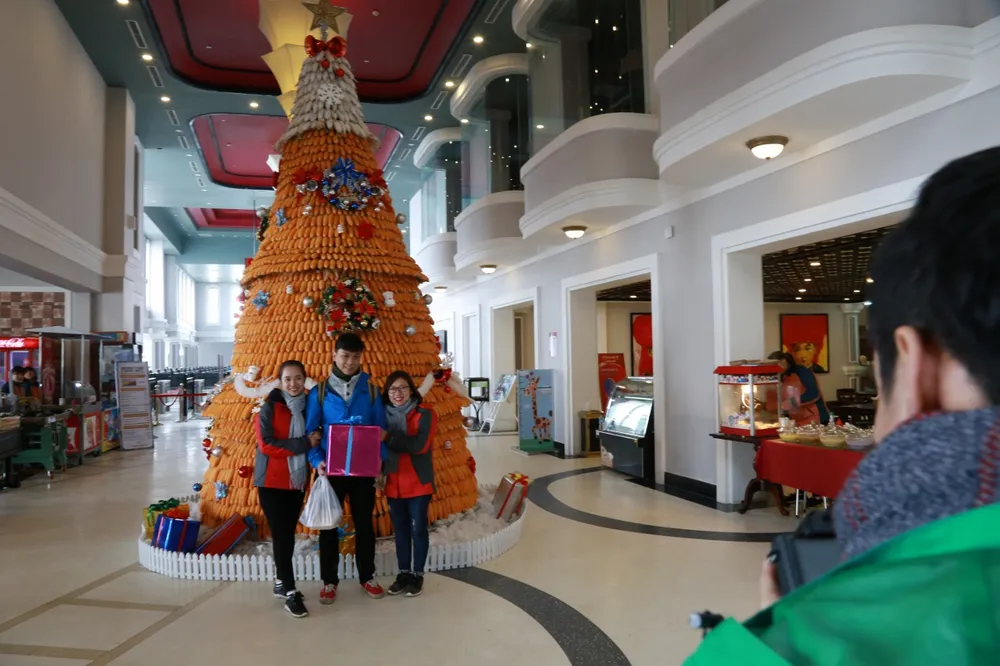 Ấn tượng nhất trong Lễ hội mùa đông Sun World Fansipan Legend là những cây thông Noel độc nhất vô nhị. Đón khách vào khu du lịch là cây thông Noel hình chóp tam giác biểu trưng cho đỉnh cao 3.143m rực rỡ màu sắc. Còn trong khuôn viên ga đi cáp treo, du khách sẽ thật thích thú khi được chiêm ngưỡng cây thông cao 6 mét được kết bằng hơn 5.000 bắp ngô vàng óng. Chưa hết, những đặc sản của vùng Tây Bắc sẽ còn khiến bạn bất ngờ hơn nữa khi ngay cạnh khu vực đỉnh Fansipan, 1 tấn trái su su được sử dụng để kết thành cây thông cao 5 mét.