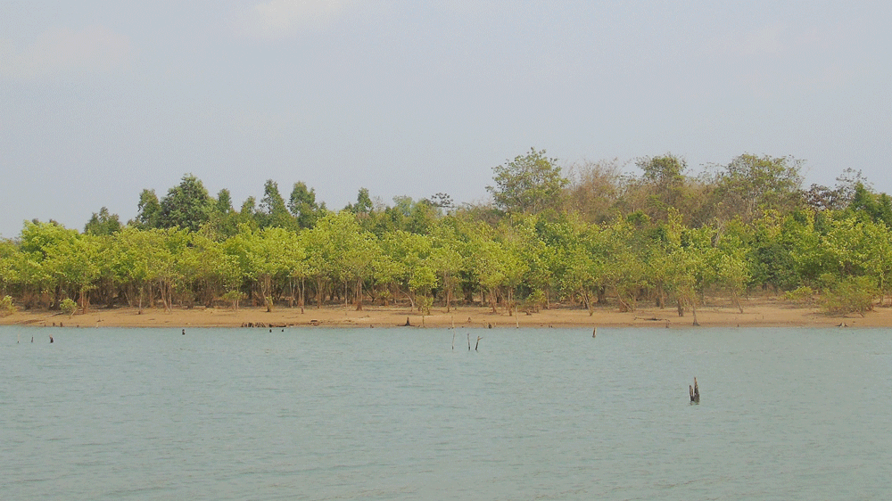 Theo hướng tay anh May chỉ, chúng tôi thu trọn vào tầm mắt màu xanh non của những rừng cây gáo nước trải dài đến tận biên giới với Vương quốc Campuchia, mang đến cảm giác gần gũi, thư thái, dù đang là cao điểm mùa khô với mức cháy rừng đang ở cấp V - cấp cực kỳ nguy hiểm. Chính màu xanh non bao phủ khắp vùng lòng hồ ấy đã làm cho cái nắng trời chiều chói chang ở vùng biên giới dịu bớt đi rất nhiều.