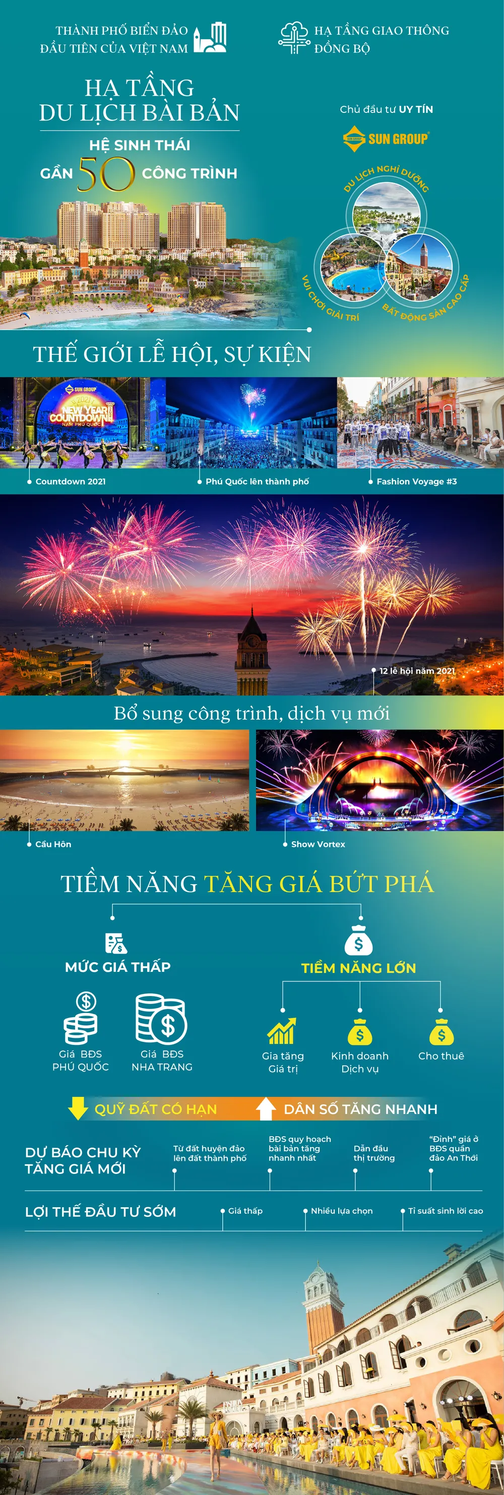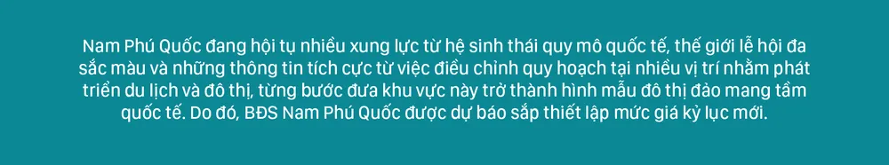 Nam Phú Quốc đang hội tụ nhiều xung lực từ hệ sinh thái quy mô quốc tế, thế giới lễ hội đa sắc màu và những thông tin tích cực từ việc điều chỉnh quy hoạch tại nhiều vị trí nhằm phát triển du lịch và đô thị, từng bước đưa khu vực này trở thành hình mẫu đô thị đảo mang tầm quốc tế. Do đó, BĐS Nam Phú Quốc được dự báo sắp thiết lập mức giá kỷ lục mới.