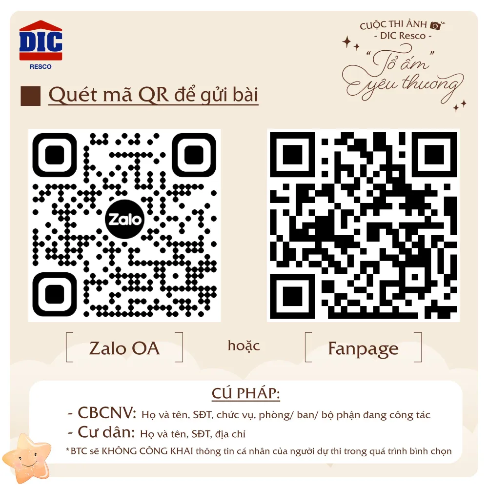 ● Cư dân: gửi bài dự thi tới Ban quản lý tòa nhà đang cư trú hoặc Fanpage DIC Resco, Zalo OA DIC Resco kèm cú pháp: Họ và tên, số điện thoại, địa chỉ liên hệ.