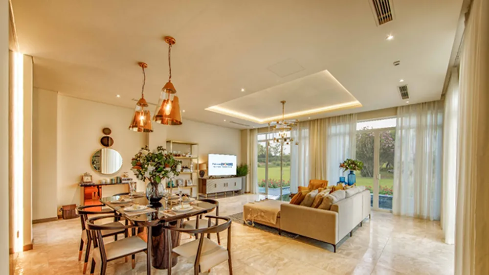 Bên trong mỗi căn biệt thự tứ lập Wonderland bố trí các không gian chức năng vừa mang đến sự thoải mái cho gia chủ, vừa phù hợp cho không gian nghỉ dưỡng đẳng cấp. Phòng khách và phòng ăn hạn chế vách ngăn với gam màu trắng chủ đạo cùng các cửa kính rộng, giúp kết nối với không gian tự nhiên bên ngoài.