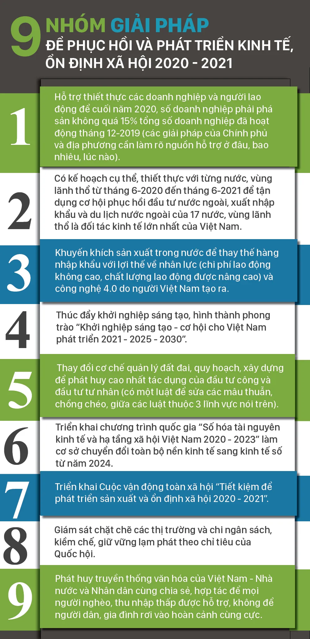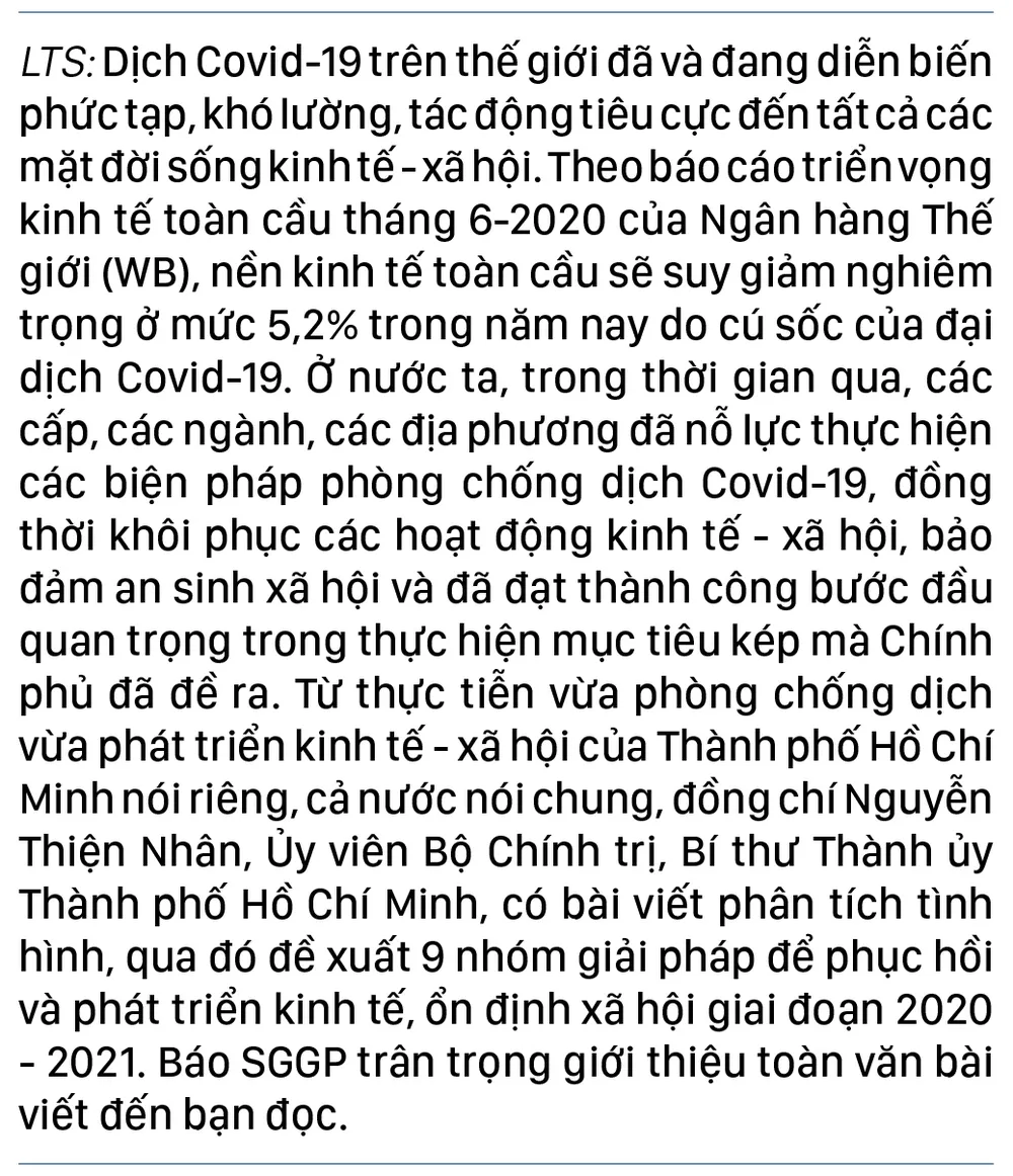 Từ các nhận định trên và kinh nghiệm thực tiễn thời gian qua, tôi xin đề xuất 9 nhóm giải pháp để phục hồi và phát triển kinh tế, ổn định xã hội 2020 - 2021 như sau: