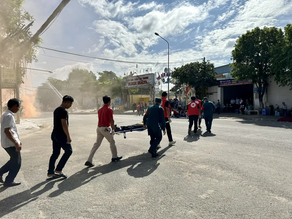 Tình huống giả định, lúc 8 giờ 30 cùng ngày, mưa kèm sét đánh trúng 5 căn nhà liền kề ở khu dân cư dẫn tới cháy, nổ. Ngọn lửa bùng cháy và có nguy cơ lan rộng ra nhà dân bên cạnh.