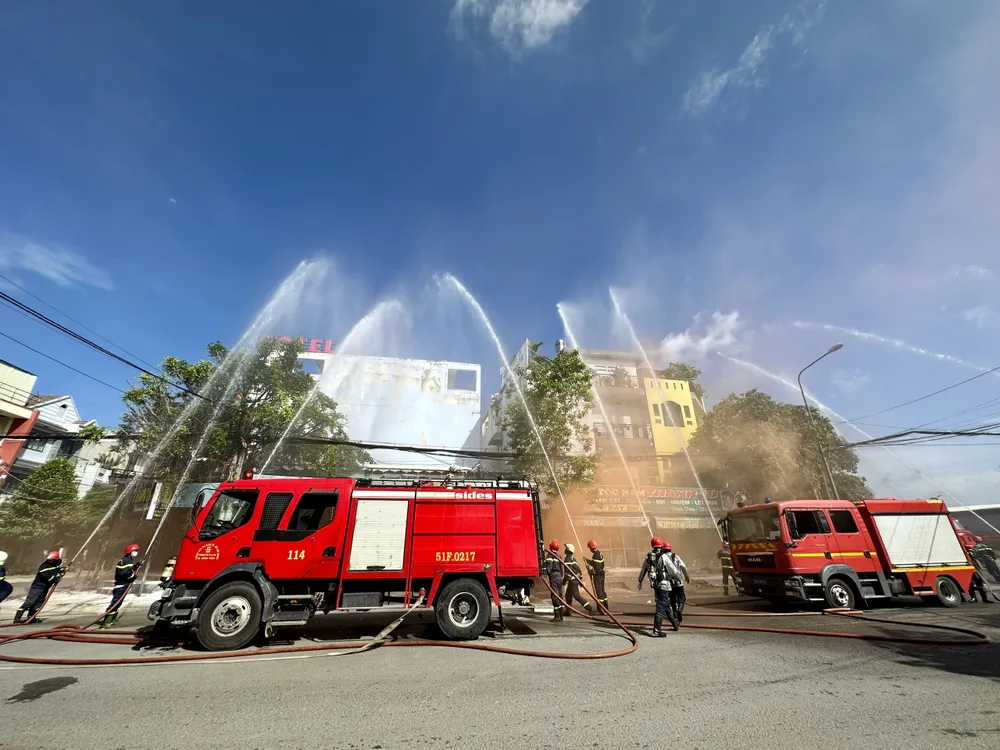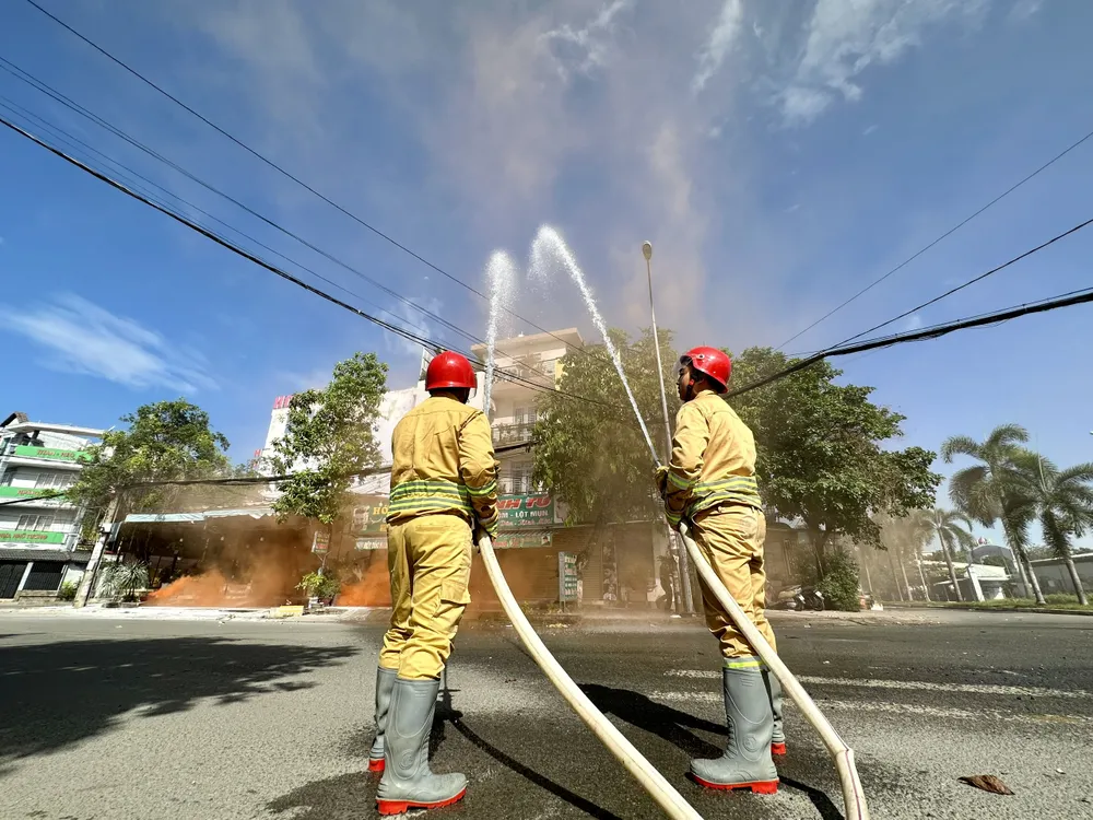 Lực lượng chức năng chữa cháy tại hiện trường. Ảnh: CHÍ THẠCH |