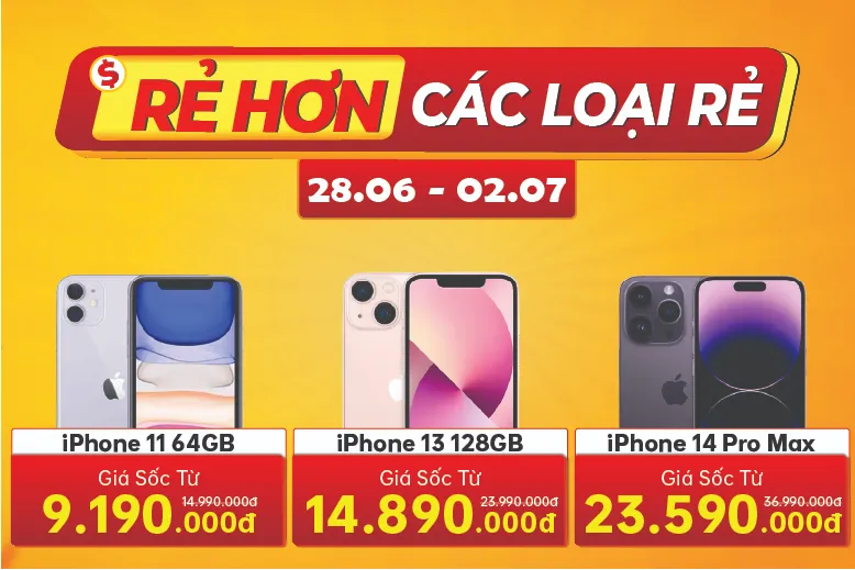 Trong dịp này, điện thoại, MacBook, Tablet tại Di Động Việt vẫn sẽ “Rẻ hơn các loại rẻ” với mức giảm chạm đáy hơn 10 triệu đồng. Các dòng điện thoại, như: iPhone 11 128GB VN/A chỉ còn từ 9,19 triệu đồng (niêm yết 14,99 triệu đồng); iPhone 13 128GB VN/A chỉ còn từ 14,89 triệu đồng; iPhone 14 Pro Max 128GB VN/A chỉ còn từ 23,59 triệu đồng (niêm yết 33,99 triệu đồng).