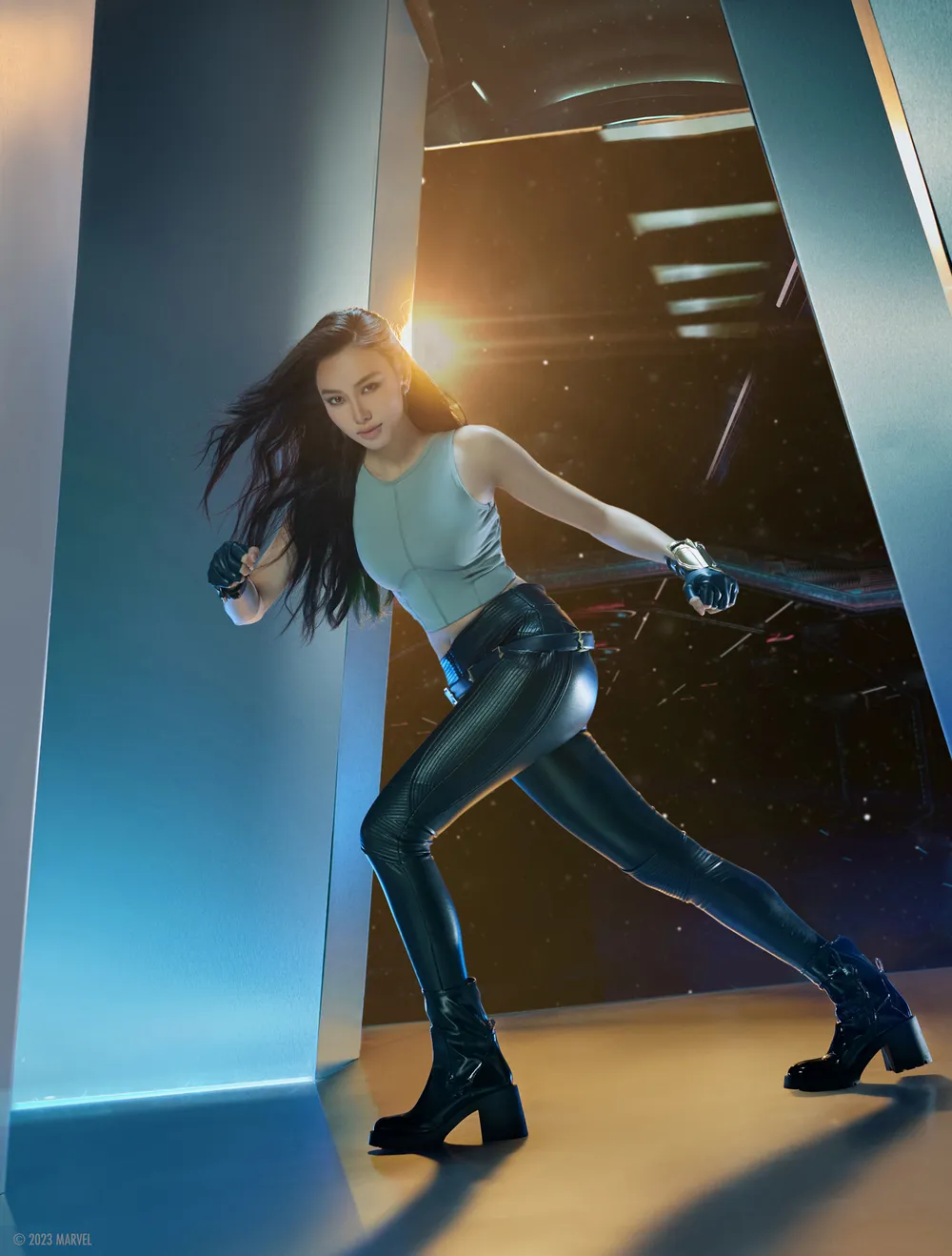 Trong bộ ảnh này, Thùy Tiên hóa thân thành 2 tạo hình khác nhau. Bộ đầu tiên là thường phục được nữ chính Carol Danvers mặc hằng ngày, kết hợp từ áo tank top bó sát và quần da đen. Khán giả sẽ dễ dàng bắt gặp phần trang phục này trong các trailer của The Marvels, khi Danvers đang bàn bạc trước khi dấn thân vào nhiệm vụ.