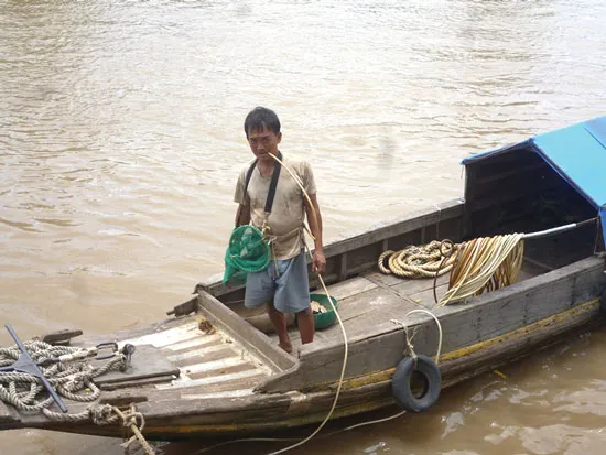 Trời nắng chang chang, nước ròng, vợ chồng ông Ôn Văn Minh (57 tuổi, ở khu phố 7, thị trấn Mỏ Cày, huyện Mỏ Cày Nam, tỉnh Bến Tre) lại thả ghe xuôi theo con nước, mang theo đủ đồ nghề ra tận ngoài sông Hàm Luông để bắt đầu chuyến đi nhặt ve chai. Mùa nào cũng vậy, nước ngoài con sông Hàm Luông chảy xiết, gió thổi lồng lộng. Ra tới sông lớn, mặc cho nước cả, sông sâu, người thợ lặn này chỉ quấn sợi dây thở lên mình rồi ngậm vào miệng, nhảy ào xuống nước, “biến mất” đến vài ba giờ đồng hồ mới ngoi lên, trước bụng đeo theo cái túi đựng sắt vụn vừa lượm được mang lên ghe. Đến chiều tối, nước lớn, họ lại thu dọn dụng cụ xuôi theo con nước trở về.