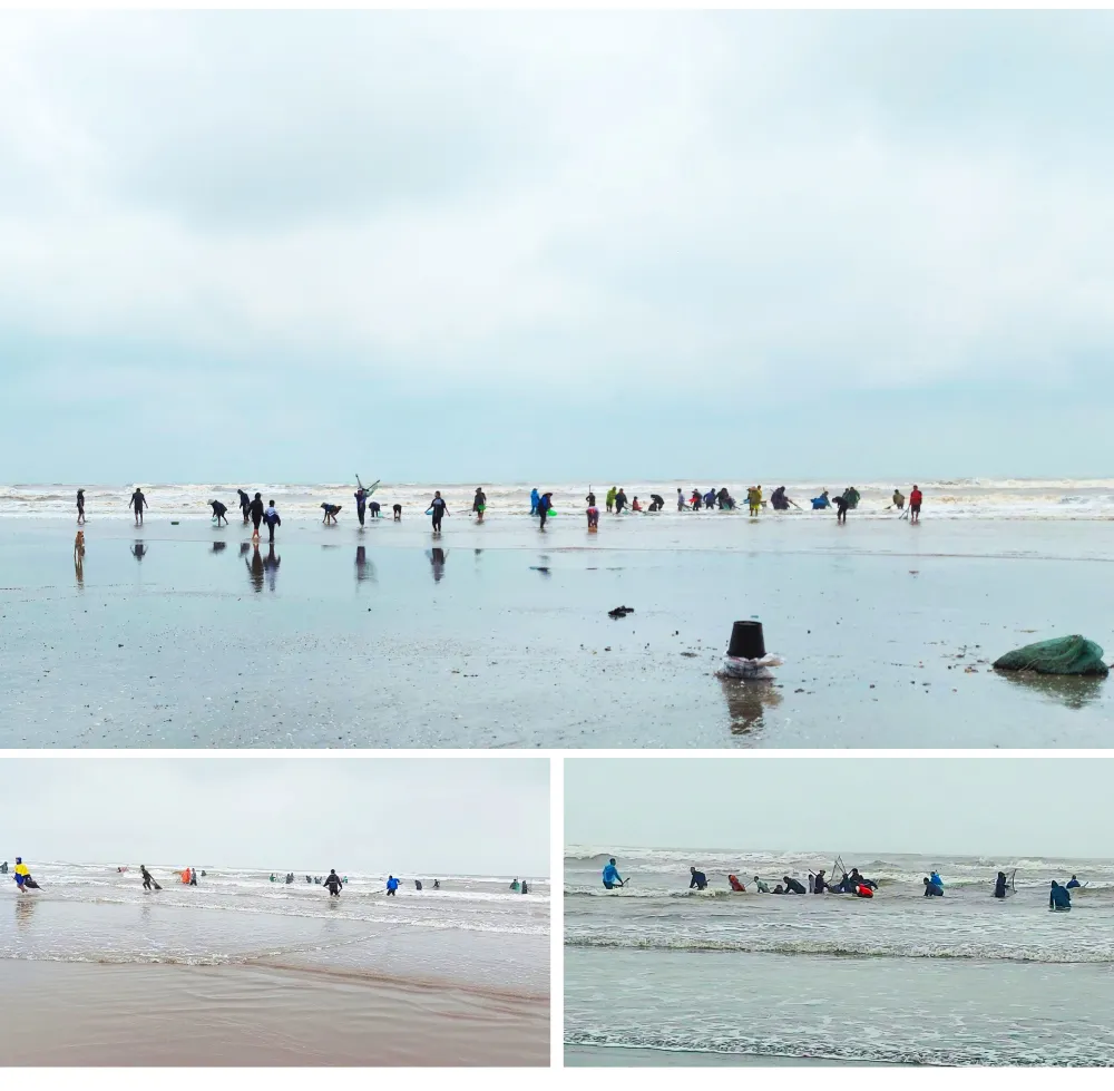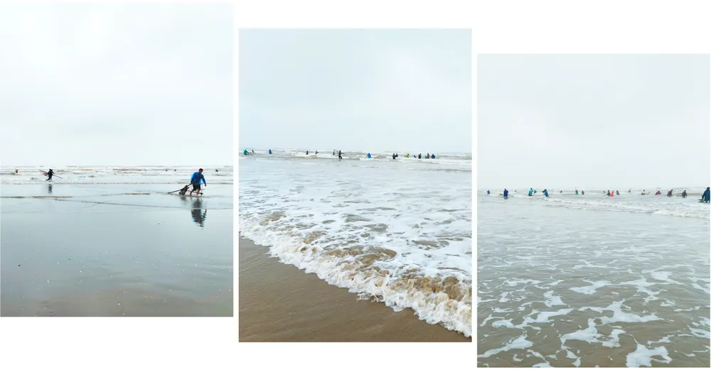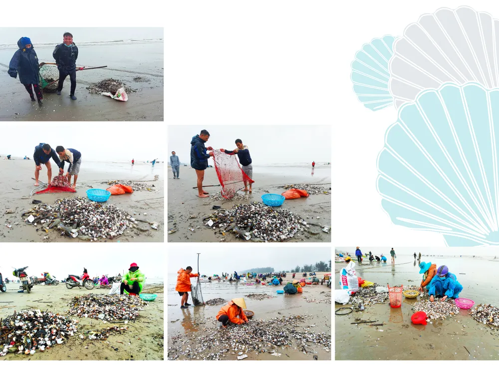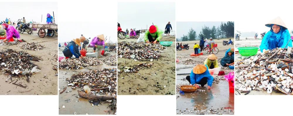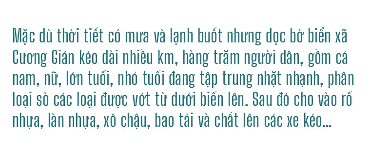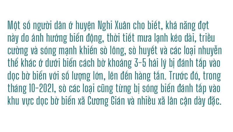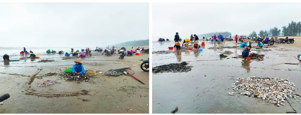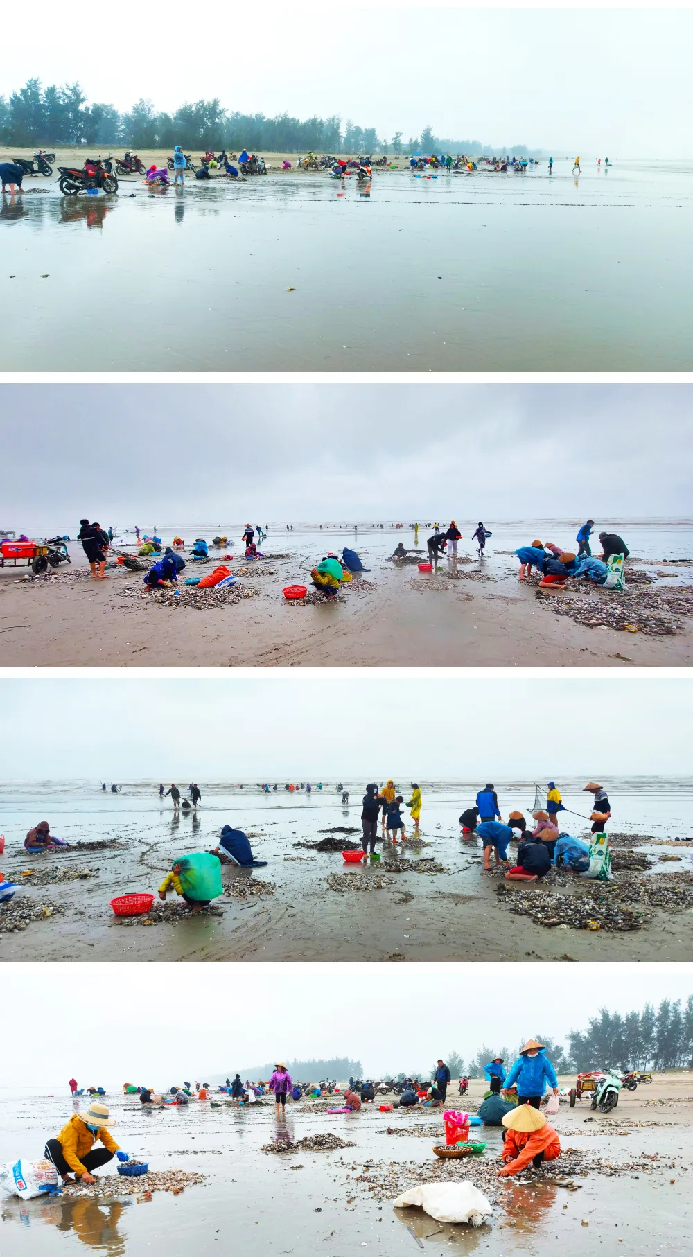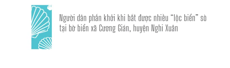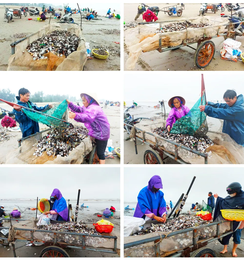 Khoảng 4 ngày trở lại đây, có hàng trăm người dân đã mang theo các loại vật dụng thủ công đổ xô ra khu vực dọc bờ biển xã Cương Gián (huyện Nghi Xuân, tỉnh Hà Tĩnh) để vớt bắt “lộc biển” sò lông, sò huyết tươi rói và một số loại nhuyễn thể khác do sóng đánh tấp vào với số lượng rất lớn.