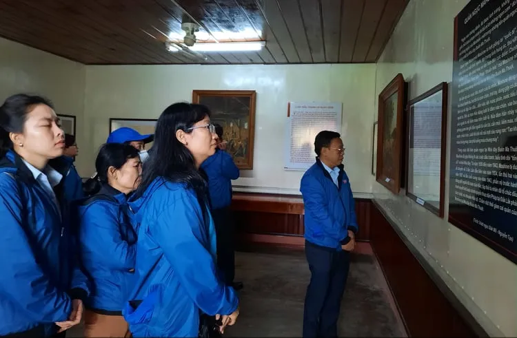 Các thành viên trong đoàn tìm hiểu tư liệu về Nhà đày Buôn Ma Thuột