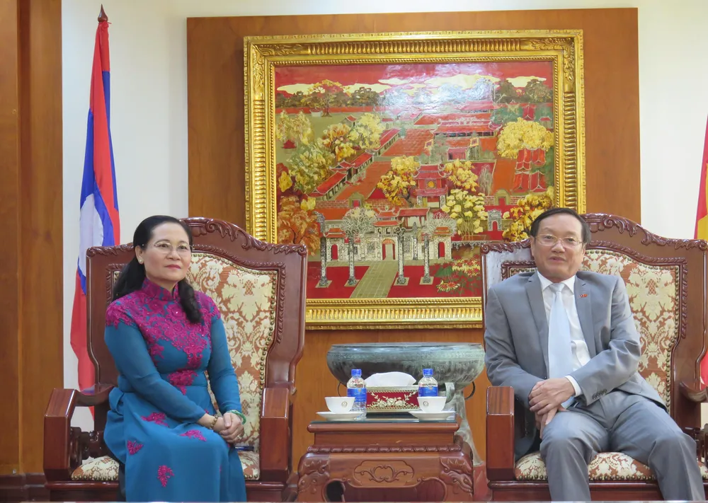 Tại Tòa Đô chính thủ đô Viêng Chăn, đồng chí Nguyễn Thị Lệ và đoàn đại biểu đã chào xã giao đồng chí TS. Sinlavong Khutphaythun, Ủy viên Bộ Chính trị, Bí thư Thành ủy, Đô trưởng thủ đô Viêng Chăn.