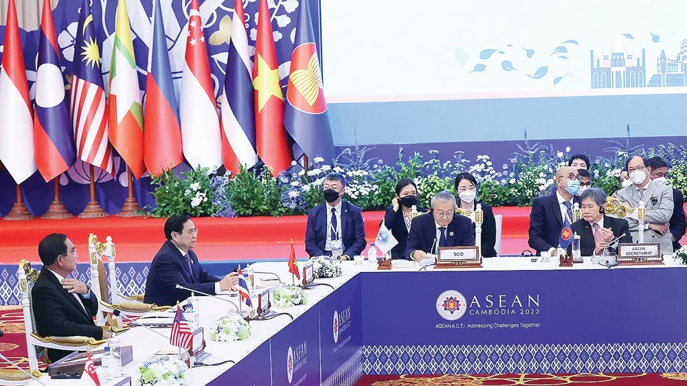 Thủ tướng Phạm Minh Chính khẳng định lập trường nguyên tắc của ASEAN về Biển Đông, đề nghị các nước cùng nhau xây dựng Biển Đông thành vùng biển hòa bình, ổn định, hợp tác và phát triển bền vững, giải quyết hòa bình các mâu thuẫn, kêu gọi cộng đồng quốc tế và các nước EAS ủng hộ nỗ lực sớm đạt được Bộ Quy tắc ứng xử ở Biển Đông (COC) hiệu lực, hiệu quả, công bằng và hợp lý với tất cả các bên có liên quan, phù hợp với luật pháp quốc tế và UNCLOS 1982. Thủ tướng đề nghị các đối tác EAS ủng hộ ASEAN thực hiện đồng thuận 5 điểm, hỗ trợ Myanmar tìm kiếm giải pháp ổn định tình hình.