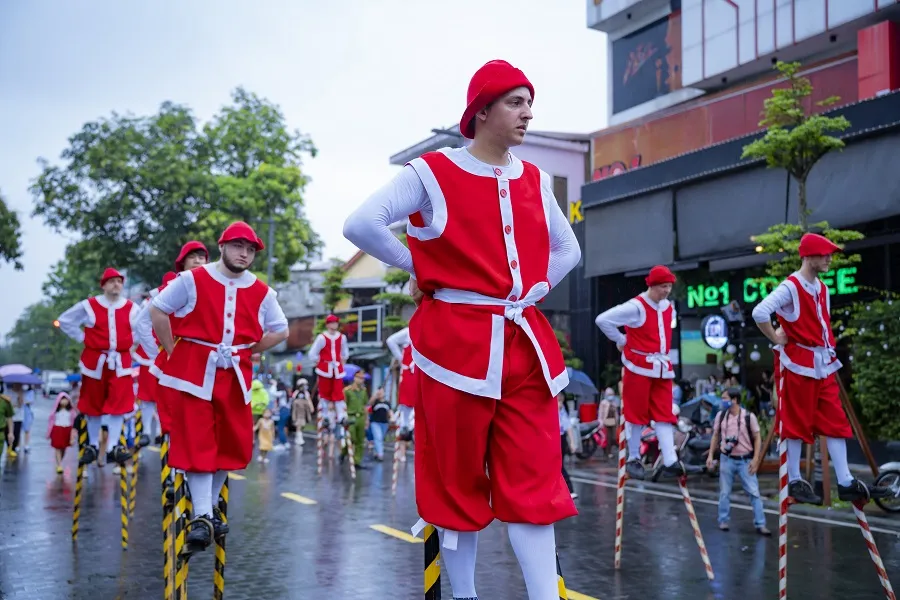 Chiều 30-4, những màn biểu diễn đi cà kheo đặc sắc dưới mưa của các nghệ sĩ Đoàn nghệ thuật cà kheo thành phố Namur (Bỉ) mang đến không khí rộn ràng, vui tươi, đầy sắc màu cho đường phố Huế.