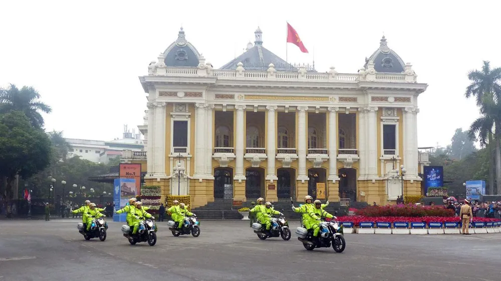Đoàn xe ngang qua Nhà hát Lớn, Hà Nội. Ảnh: TRẦN LƯU