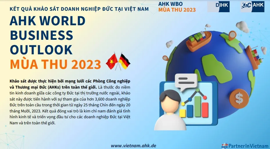Ngày 21-11, Phòng Công nghiệp và thương mại Đức (AHK Việt Nam) công bố kết quả khảo sát AHK World Business Outlook - mùa thu 2023. Cuộc khảo sát (thực hiện với hơn 3.600 doanh nghiệp, từ ngày 25-9 đến ngày 20-10-2023) tập trung vào đánh giá tình hình kinh doanh, kỳ vọng, hoạt động đầu tư và rủi ro liên quan mà các công ty Đức đang hoạt động tại Việt Nam phải đối mặt.