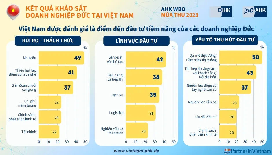 Cùng với đó, kết quả khảo sát cho thấy xu hướng các doanh nghiệp Đức đang triển khai chiến lược “Trung Quốc +1”, tập trung vào các dự án đầu tư xanh. Thị trường Việt Nam đã sẵn sàng chào đón và hỗ trợ những dự án kinh doanh như vậy bằng cách cung cấp nền tảng cho sự tăng trưởng, đa dạng hóa và thực hiện các hoạt động kinh doanh bền vững.