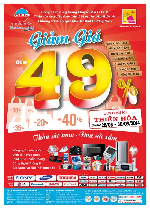 Chào mừng sự kiện Tháng Khuyến Mại TP.Hồ Chí Minh, Thiên Hòa – nhà tài trợ Vàng Tháng Khuyến Mại - cùng các tập đoàn điện tử hàng đầu thế giới như: Sony, Samsung, Toshiba, LG, Panasonic, Electrolux, Sanyo, Sharp, Fujiyama, Dell, Acer, Nokia... trân trọng gửi đến khách hàng chương trình khuyến mãi “GIẢM GIÁ ĐẾN 49%” với nhiều ưu đãi chính sách bán hàng cực kỳ hấp dẫn.