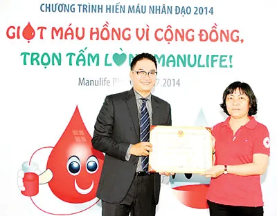 Hưởng ứng các hoạt động kỷ niệm sinh nhật lần thứ 15, Manulife Việt Nam phối hợp với Hội Chữ Thập Đỏ Quận 7 tổ chức chương trình hiến máu nhân đạo “Giọt máu hồng vì cộng đồng, trọn tấm lòng Manulife” năm 2014 tại Tòa nhà Manulife Plaza, 75 Hoàng Văn Thái, Quận 7, TP. Hồ Chí Minh vào sáng ngày 9-7-2014 với đông đảo nhân viên và đại lý tham gia đóng góp 223 đơn vị máu. Trước đó, chương trình đã được tổ chức thành công tại Văn phòng Manulife – Chi nhánh Hà Nội vào ngày 24-6-2014, hiến tặng 104 đơn vị máu. Theo kế hoạch, chương trình sẽ tiếp tục được triển khai tại nhiều địa phương khác trên toàn quốc nơi Công ty hoạt động. Đây là một hoạt động thường niên được đông đảo đại lý và nhân viên Manulife tích cực tham gia.