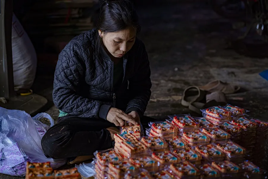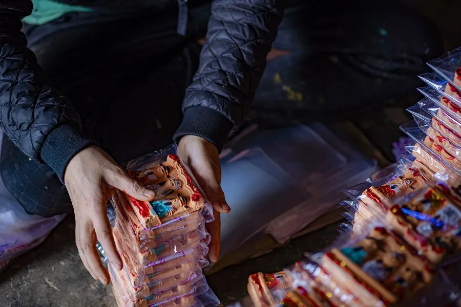 Tượng ông Táo thành phẩm sẽ được xếp vào thùng giấy mang đi bán. Mỗi hộp có khoảng 120 tượng ông Táo và được bán buôn với giá 40.000- 50.000/hộp.
