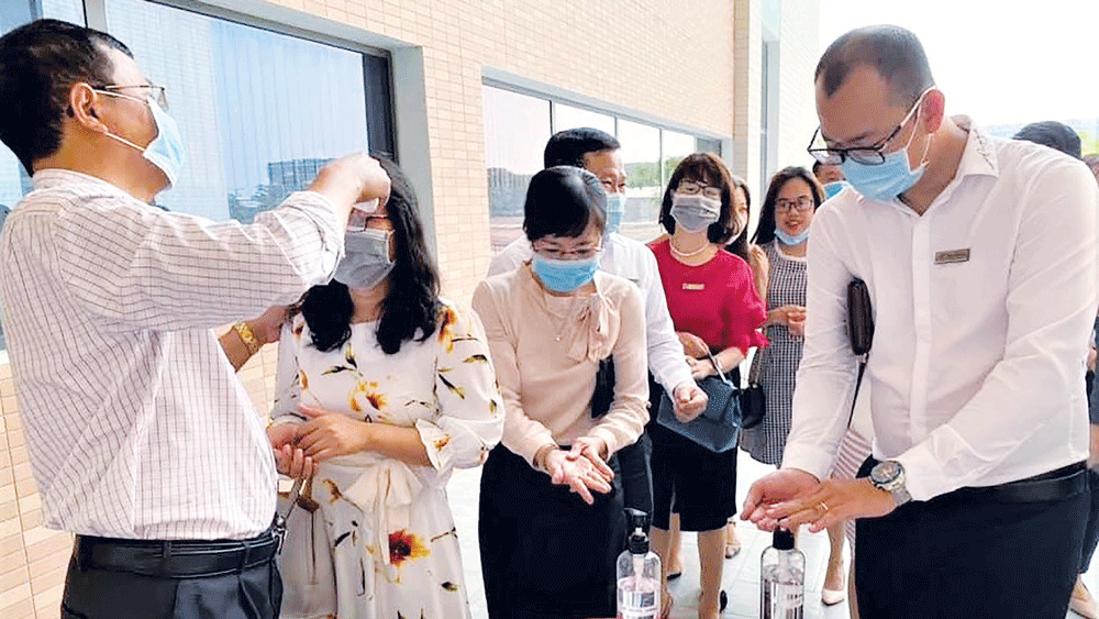 Tất cả cán bộ, giảng viên được đo thân nhiệt và rửa tay khi vào Trường ĐH Tôn Đức Thắng