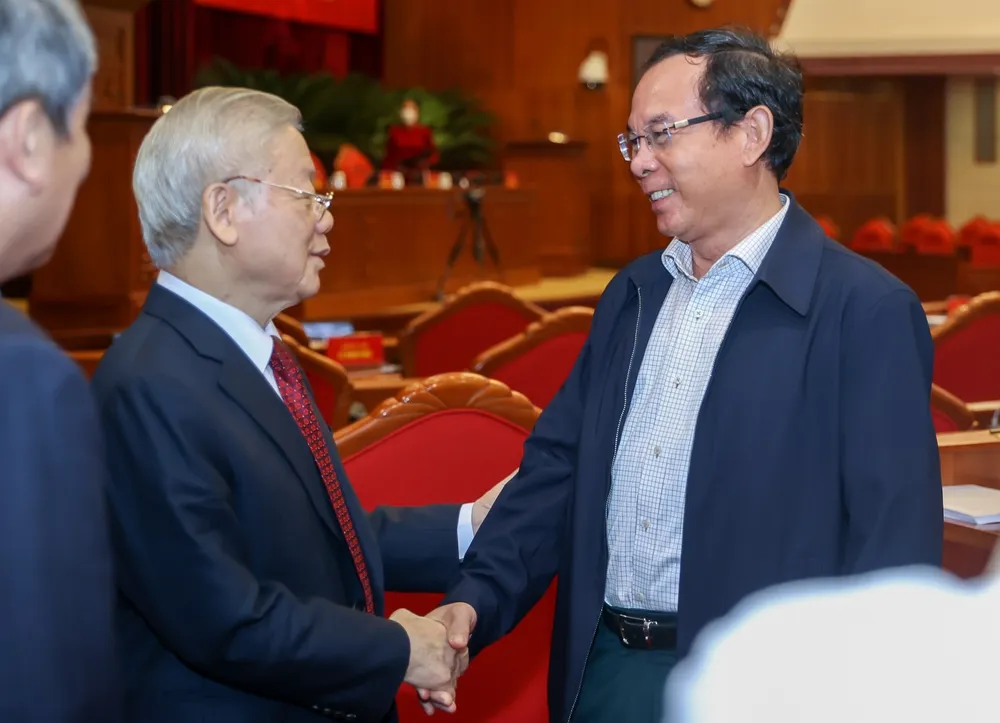 Tổng Bí thư Nguyễn Phú Trọng trao đổi với Bí thư Thành ủy TPHCM Nguyễn Văn Nên tại hội nghị. Ảnh: VIẾT CHUNG