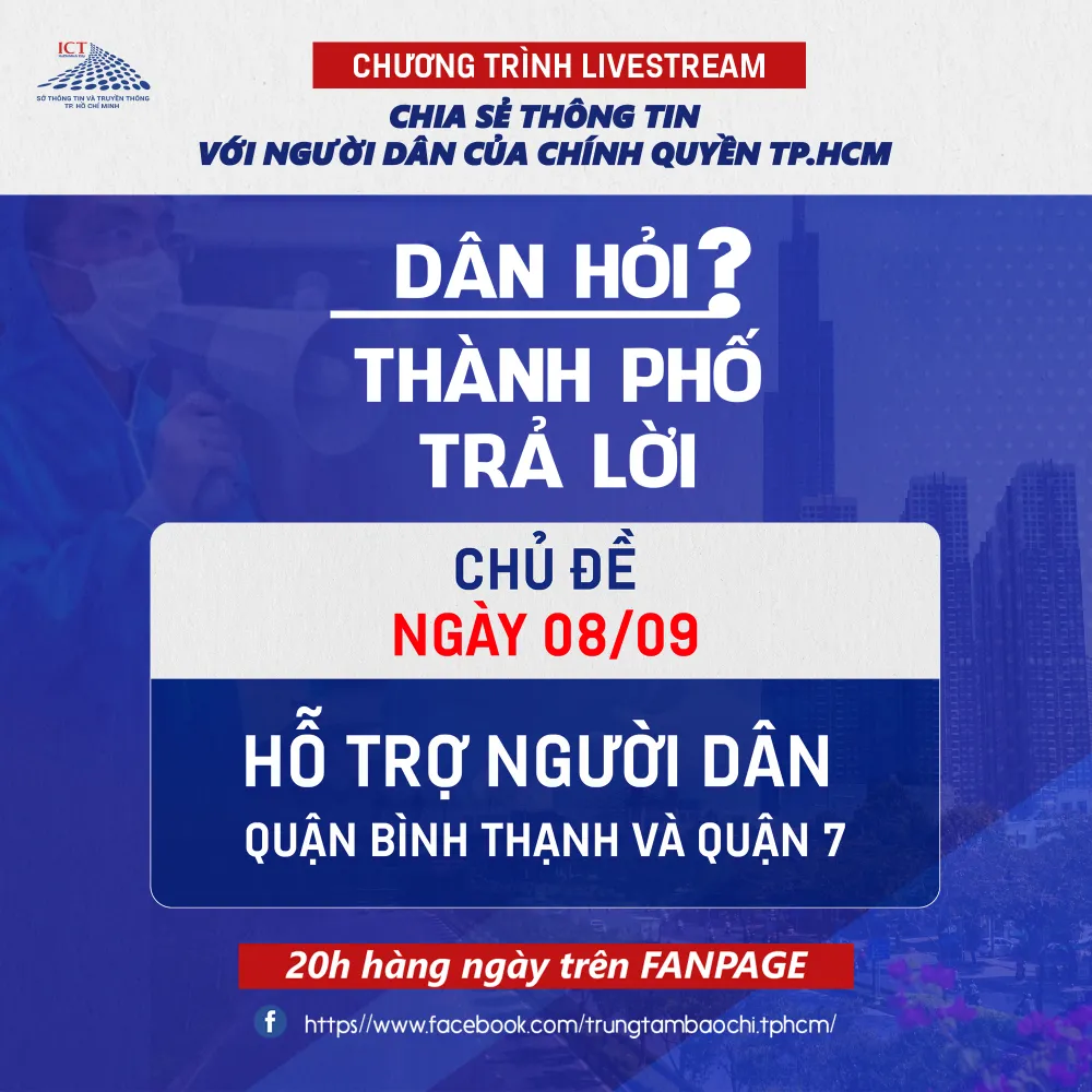 Vào lúc 20 giờ tối nay 8-9, livestream “Dân hỏi – Thành phố trả lời” sẽ giải đáp trực tiếp thắc mắc của người dân về các vấn đề đang tồn tại nhằm “Hỗ trợ người dân quận Bình Thạnh và quận 7”. Bạn đọc đón xem và đối thoại trực tiếp với Chủ tịch UBND quận Bình Thạnh và quận 7. SGGPO và Fanpage Báo Sài Gòn Giải Phóng xin thông tin trực tiếp đến bạn đọc nội dung buổi livestream này.