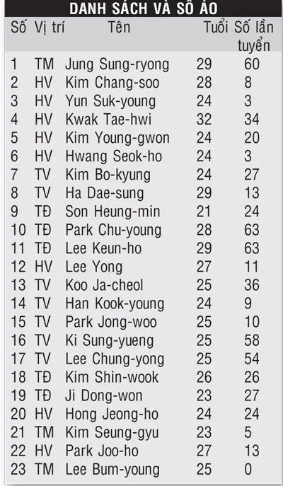 Thật vậy, nếu liếc qua danh sách 23 cầu thủ của đội tuyển Hàn Quốc tham dự VCK World Cup 2014 thì sẽ thấy đó là một trong những đội hình trẻ trung nhất tại Brazil. Với độ tuổi trung bình chỉ vào khoảng 25, trong đó có đến 14 cầu thủ từ 25 tuổi trở xuống, xem ra Hàn Quốc đã được chuẩn bị một cách khá tốt để đối phó với sức nóng như thiêu như đốt của mùa hè Nam Mỹ.