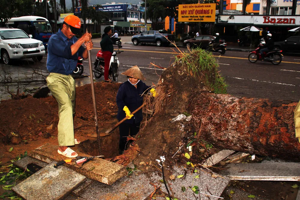 Đến chiều ngày 4-11, tại khu vực Quảng trường Nguyễn Tất Thành (TP Quy Nhơn), hàng chục cây xanh cổ thụ bị bão quật ngã, đang được các công nhân nỗ lực dọn dẹp, khôi phục.Ông Nguyễn Mỹ Quang, Giám đốc Sở LĐ-TB-XH cho biết, bão số 5 gây thiệt hại rất nặng nề cho TP Quy Nhơn và huyện Tuy Phước. Hiện đơn vị đã thống kê sơ bộ có 500 nhà dân bị thiệt hại do bão số 5, trong đó có 300 nhà bị sập hoàn toàn, 200 nhà bị hư hỏng.
