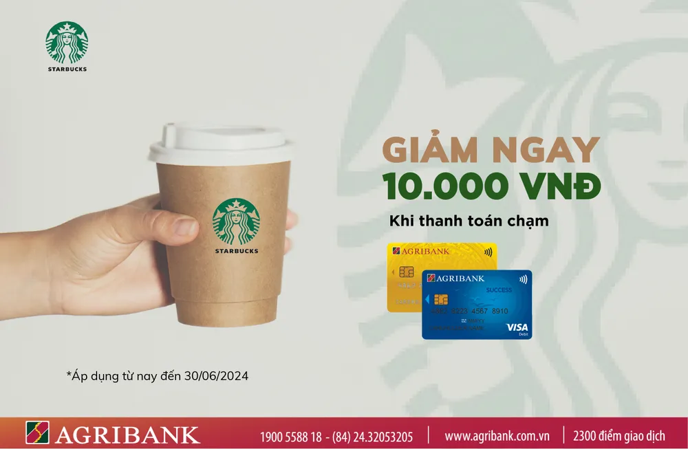 Hiện nay, khách hàng chỉ cần mở thẻ Agribank Visa và thanh toán chạm thẻ tại các cửa hàng Starbucks sẽ được giảm ngay 10.000 đồng trong thời gian từ nay đến hết ngày 30-6-2024. Các “tín đồ” Starbucks hãy nhanh tay quẹt thẻ Agribank Visa để thưởng thức ngay đồ uống đặc biệt vào mùa đông này nhé!