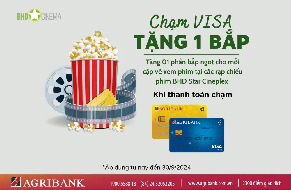Từ nay đến hết ngày 30-9-2024, khi khách hàng thanh toán chạm bằng thẻ Visa của Agribank cho 2 vé xem phim bất kỳ tại các rạp chiếu phim BHD Star Cineplex, sẽ được tặng ngay 1 phần bắp ngọt trị giá 64.000 đồng.